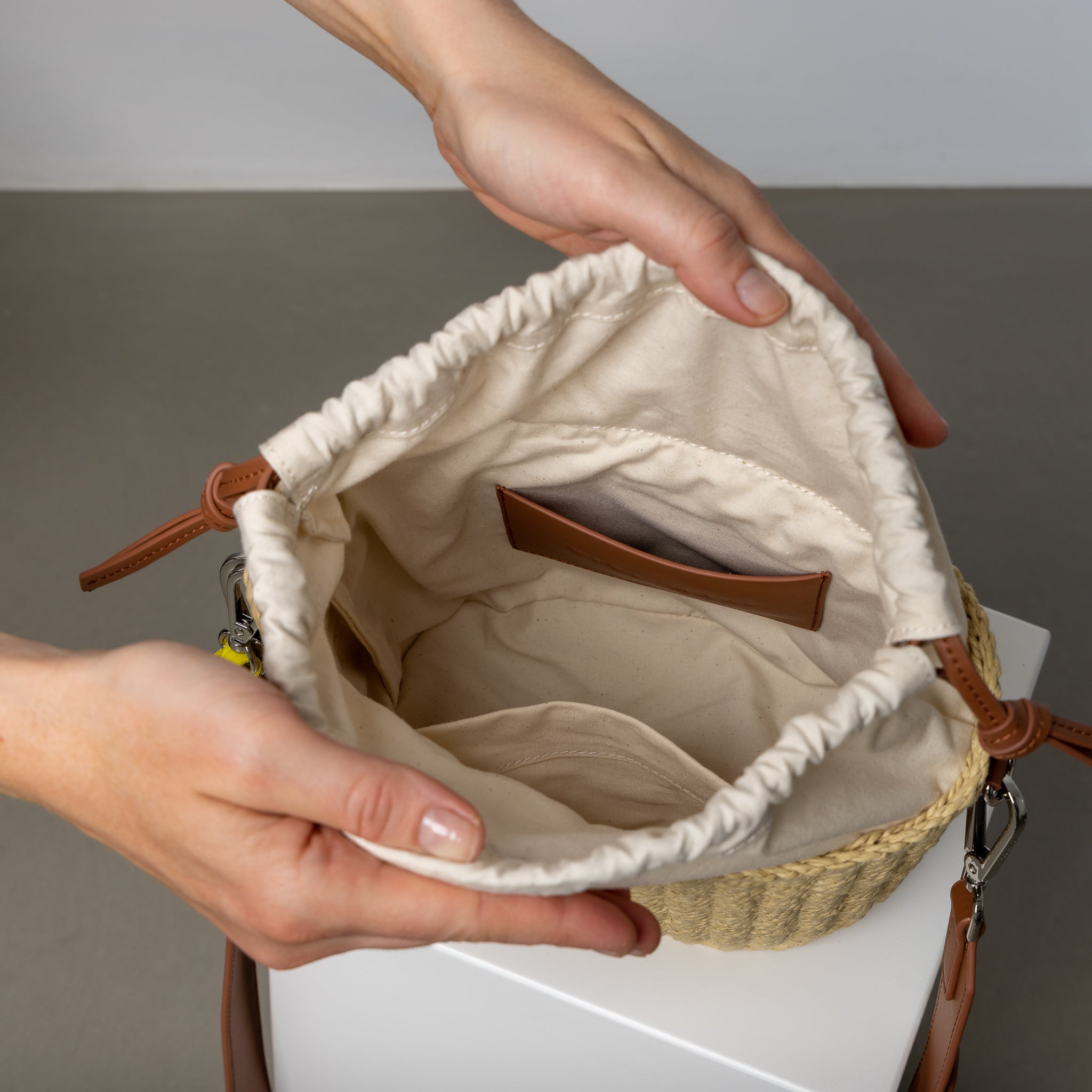 The hand woven bag body is lightweight, flexible and comfortable to wear. Variations in the weave as a result of high quality handwork add to the character of the bag and make your bag truly unique. The closable lining has two inside pockets and is made of 100% undyed organic cotton. Like the whole VIVI MARI collection the Bucket Bag Straw including all applications is vegan.