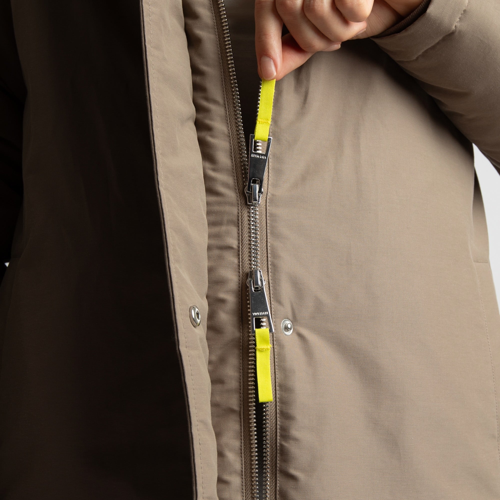 The parka was developed with a focus on using the best materials: the main fabric is made from a cotton-polyamide fabric, while the lining is made from pure polyamide.